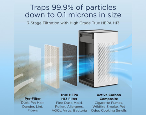 That’s even smaller than the size of a COVID particle at 0.125 microns in size. Most other purifiers use HEPA H11 filters, which capture down to just 0.3 microns.